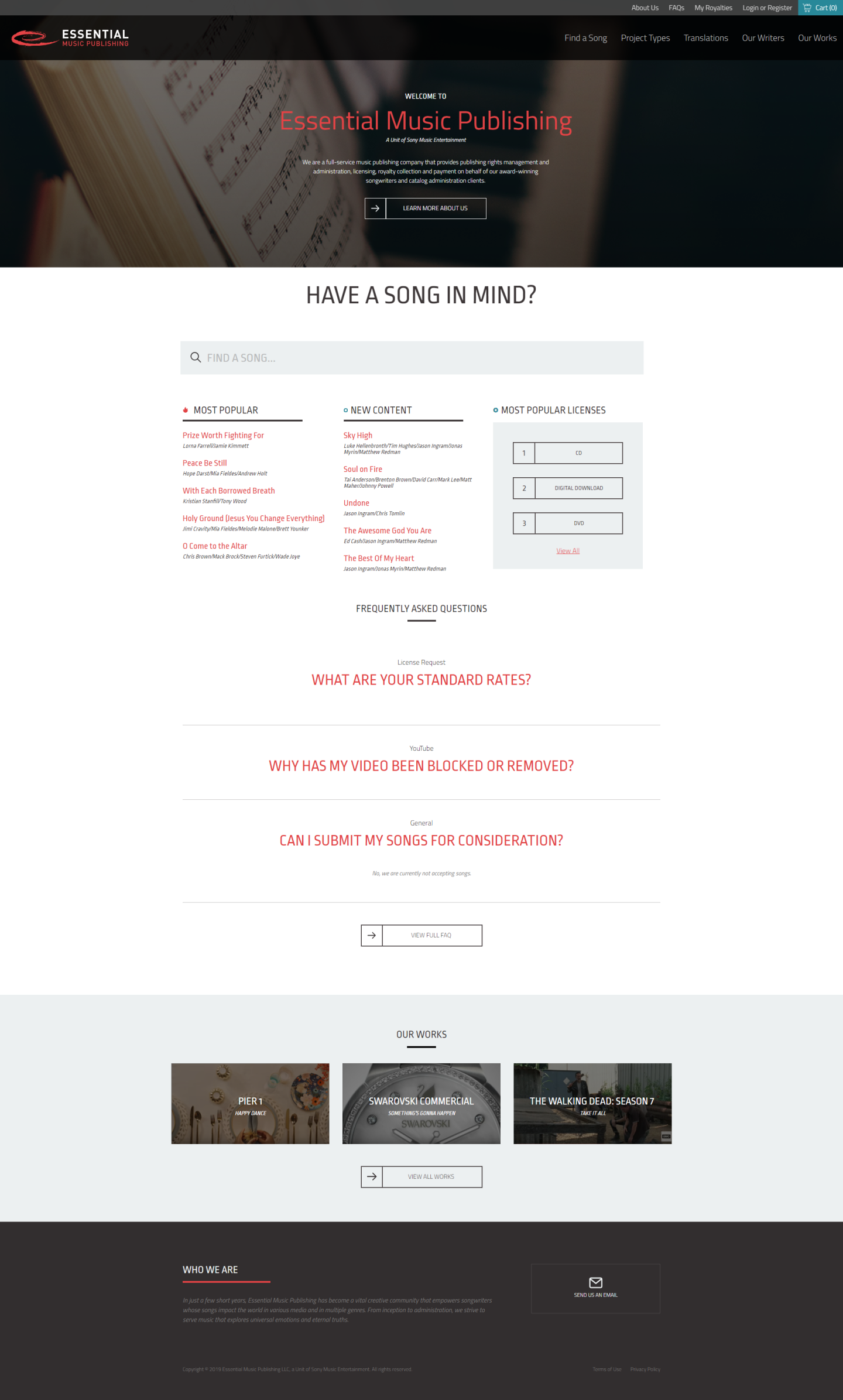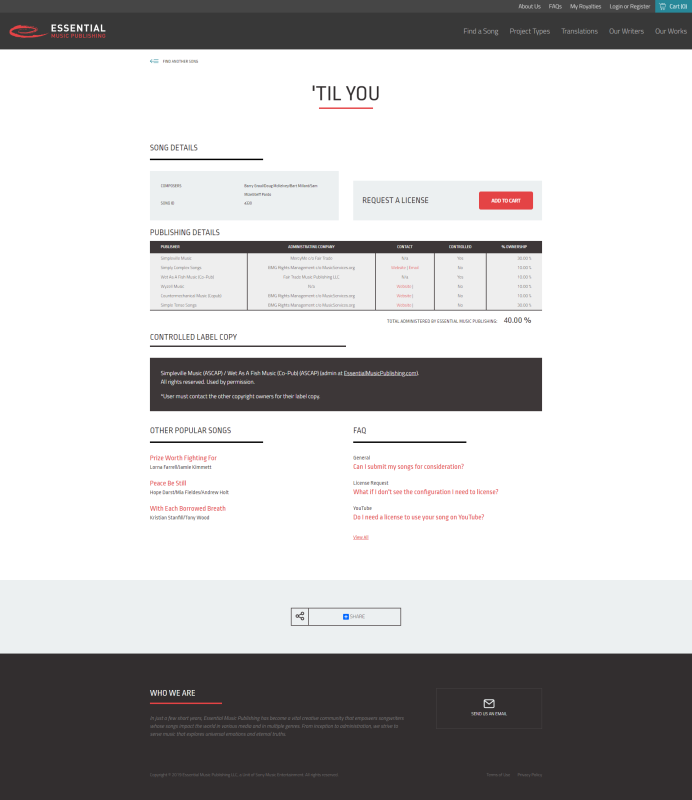 Client: Essential Music Publishing Website: https://essentialmusicpublishing.com/ Services: Drupal 7, WCAG 2.1 Audit and ADA Compliance, Custom License request tool « Flig Music Emmaus International »