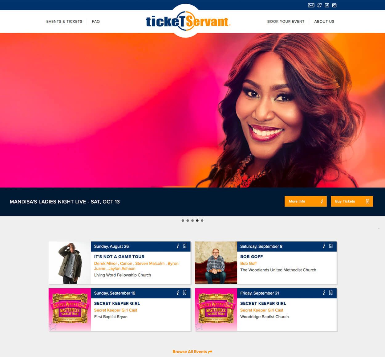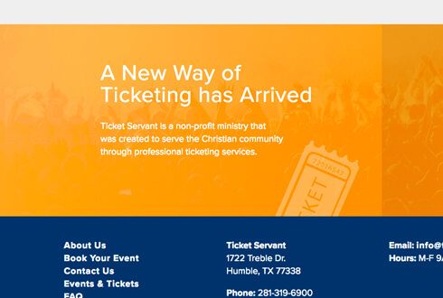 Ticket Servant, a nonprofit organization, is an outreach of the ministry of KSBJ in Houston, Texas. Formed in 1999, Ticket Servant was created to provide exceptional ticketing services to other nonprofit entities by providing ticketing services at cost. The site features events with scheduling, automated publishing, pre-sale management, as well as artist and location databases, and an easy to manage interface built on Drupal 8.